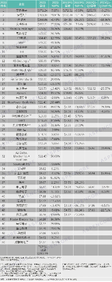 表1《国际电子商情》2022年度全球电子元器件分销商TOP 50、2023H1、2023前三季累计营收/YoY%信息汇总JXHesmc